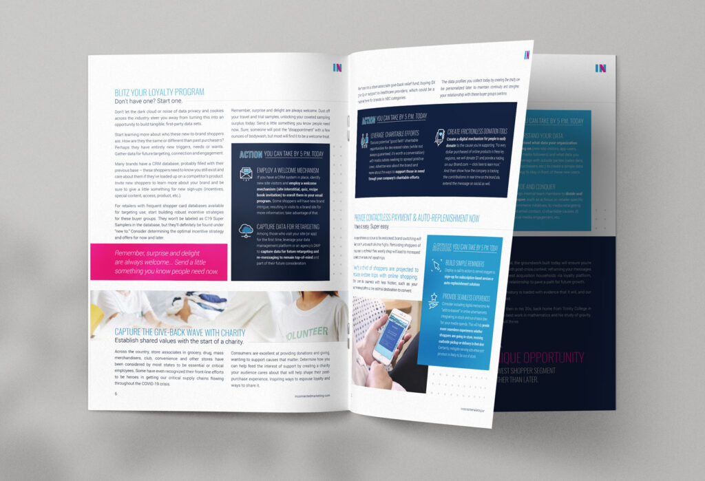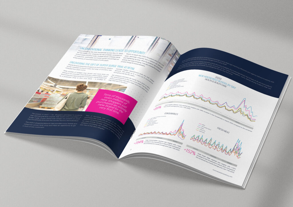 This visually-driven whitepaper was crafted to communicate complex research insights with clarity and impact. The layout strategically balances data visualization, photography, and brand messaging to guide the reader through a compelling narrative about new shopper behavior during COVID-19. Bold color blocks and iconography create visual cues for quick reading, while charts and infographics translate raw data into digestible insights.