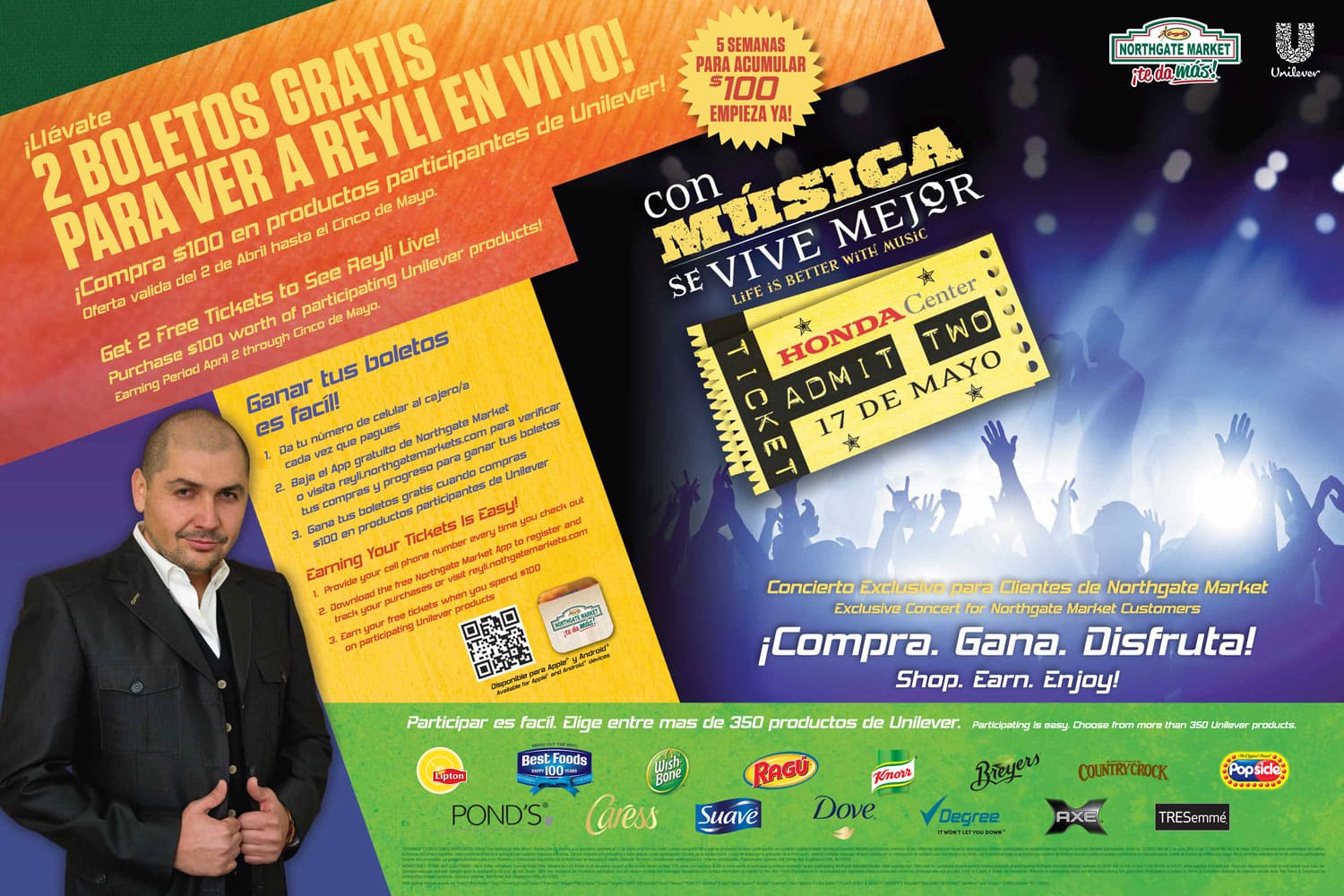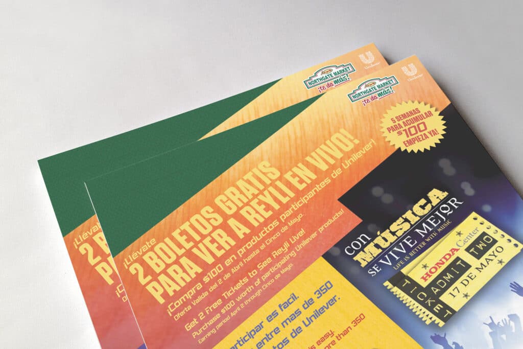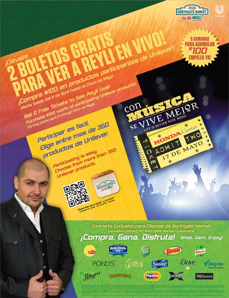 Developed bilingual shopper marketing materials for a Unilever promotion, encouraging consumers to purchase qualifying products to earn tickets to a live concert event. The design leveraged bold visuals, product branding, and clear call-to-actions in both English and Spanish to maximize reach and drive engagement at retail.