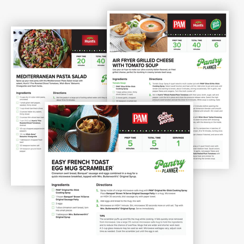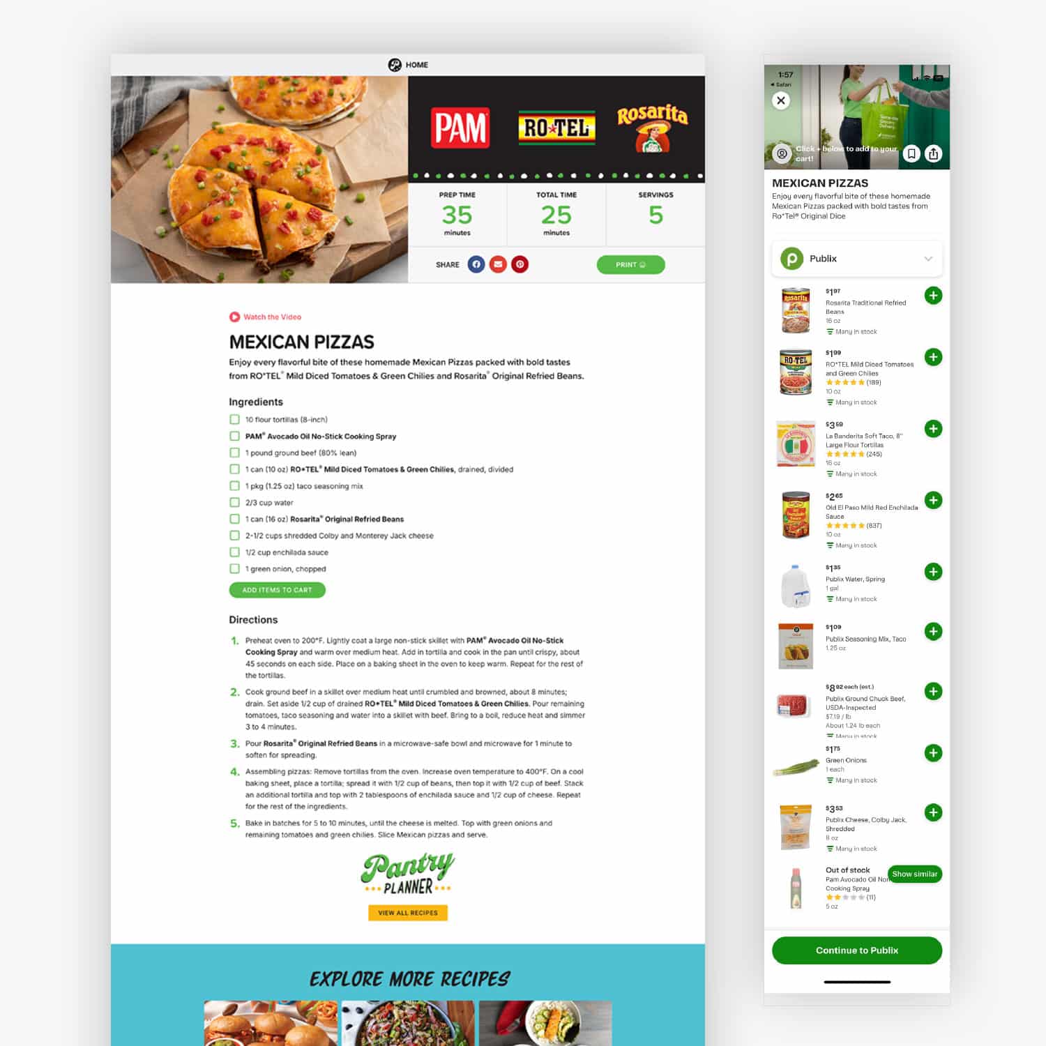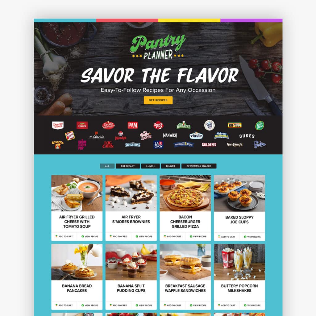 Created for a national CPG client, Pantry Planner is an integrated digital experience designed to simplify mealtime planning while showcasing a portfolio of beloved pantry brands. The site features custom illustrations, themed recipe content, and dynamic meal filters for occasions, cuisines, and ingredients. Supportive digital media—including social posts, shoppable ads, and animated display—drove traffic to the site.