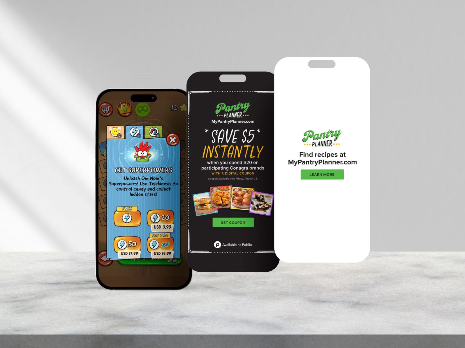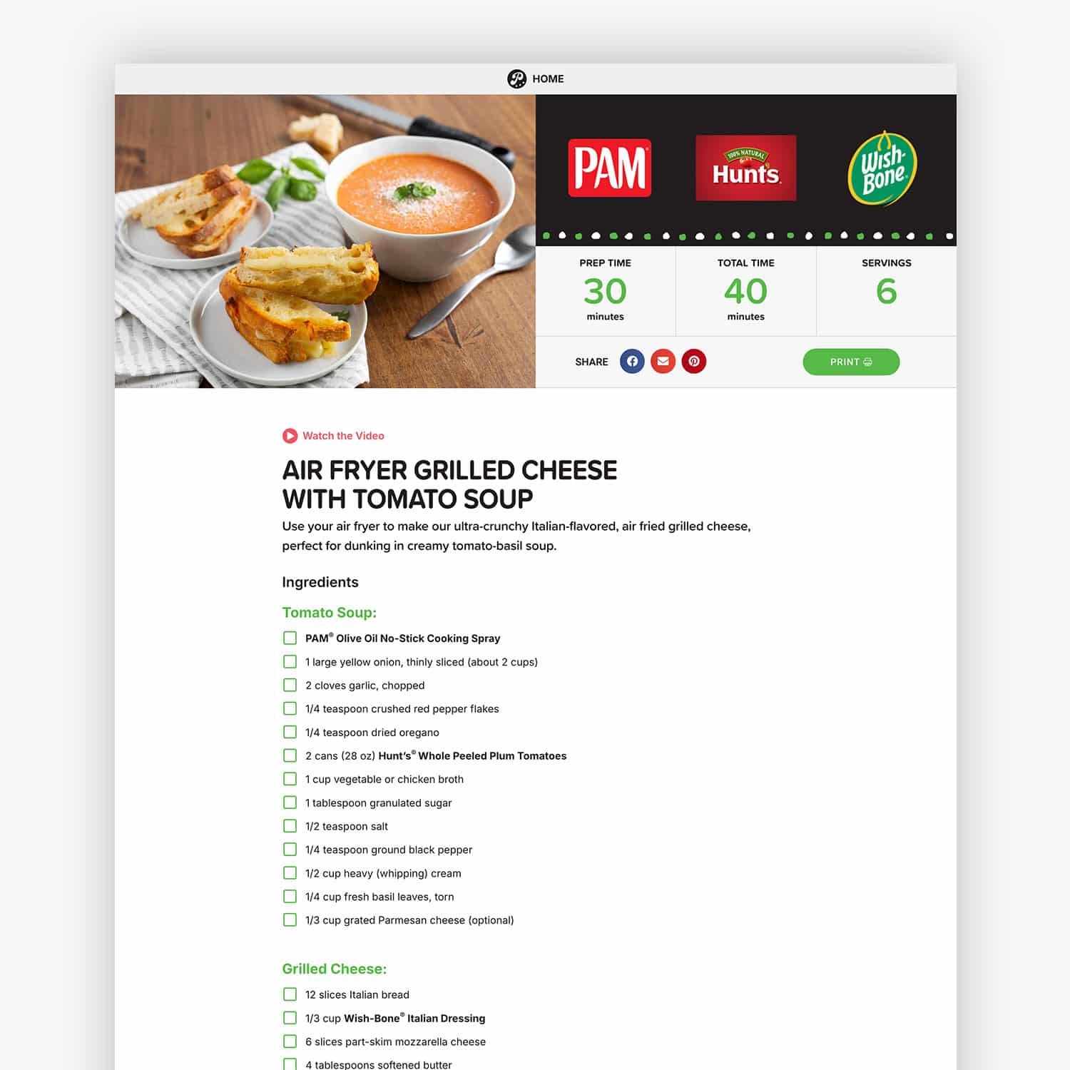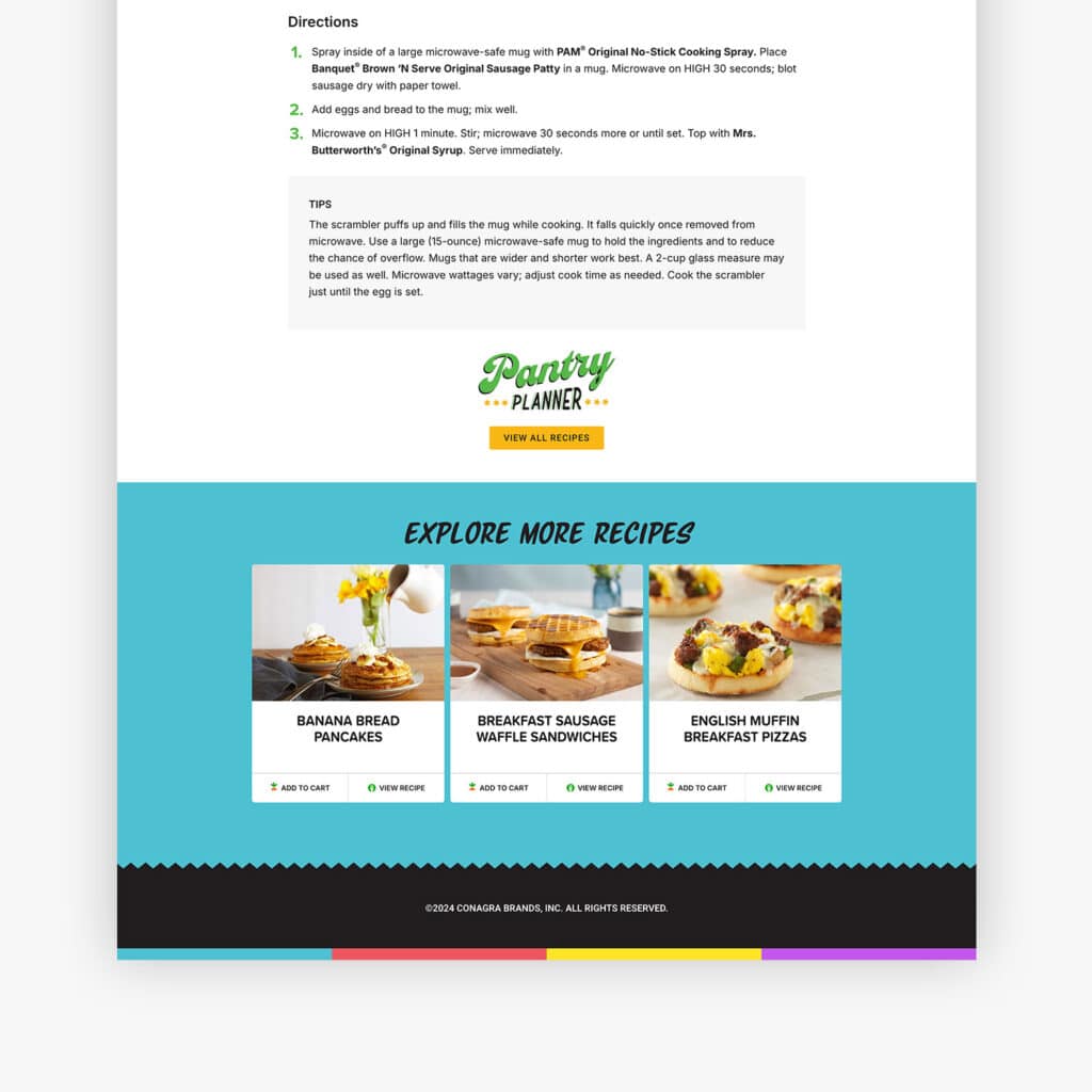 Created for a national CPG client, Pantry Planner is an integrated digital experience designed to simplify mealtime planning while showcasing a portfolio of beloved pantry brands. The site features custom illustrations, themed recipe content, and dynamic meal filters for occasions, cuisines, and ingredients. Supportive digital media—including social posts, shoppable ads, and animated display—drove traffic to the site.
