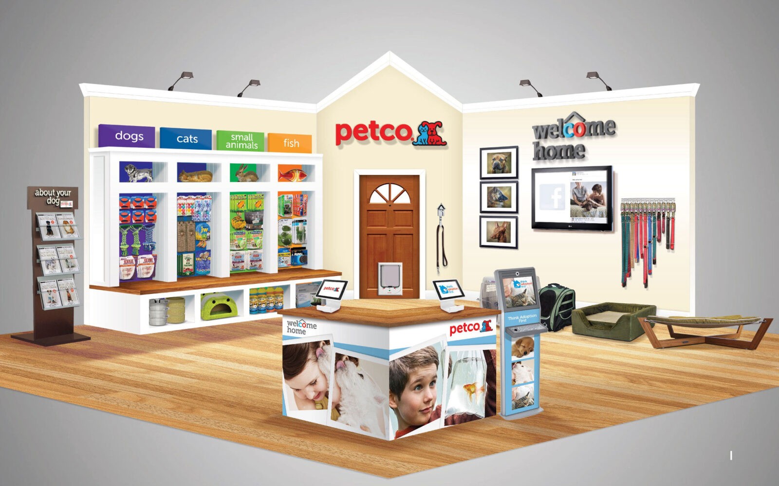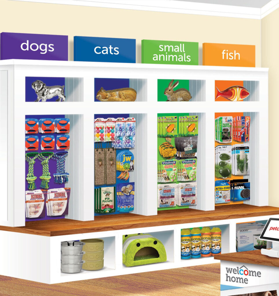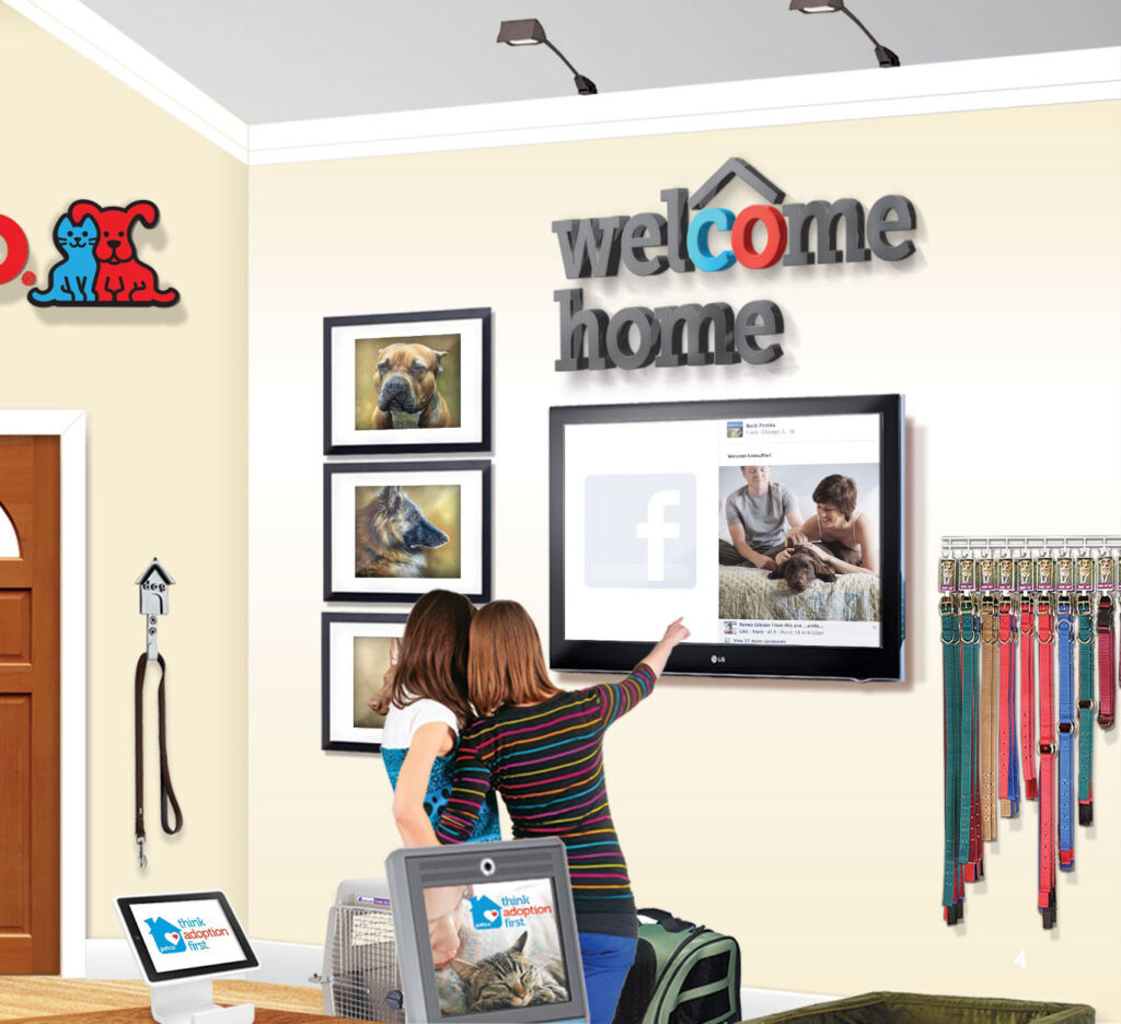 This immersive in-store concept was designed to create a welcoming, home-inspired environment that supports pet adoption and education. The layout features dedicated sections for dogs, cats, small animals, and fish, with clearly labeled categories and engaging product displays. Informational kiosks, touchscreens, and adoption literature educate shoppers and encourage informed pet ownership.