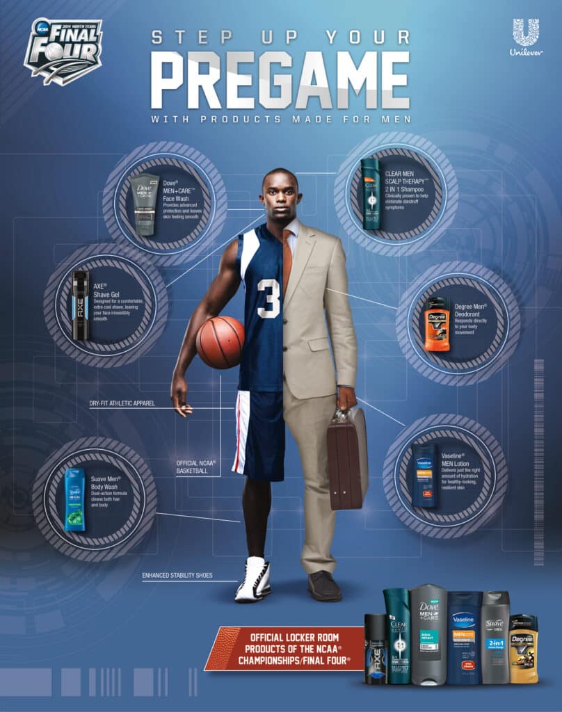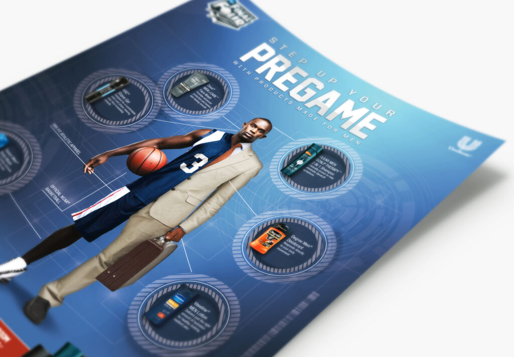 Created dynamic sports-themed promotional materials for Unilever, aligning men’s grooming products with the NCAA Final Four. The design visually connects athletic performance and professional style, leveraging bold graphics and impactful messaging to drive product visibility and consumer engagement.