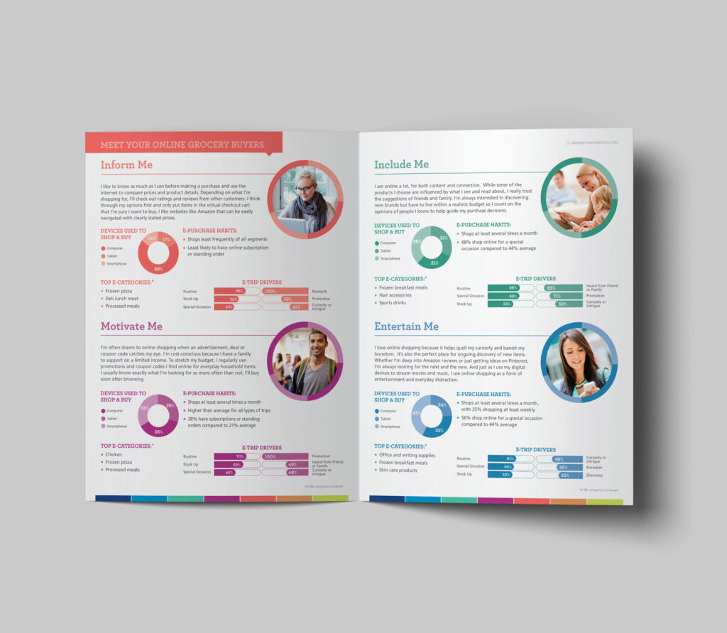 This omni-channel shopper marketing piece was designed to help brands and retailers better understand the motivations behind online grocery purchases. By segmenting digital shoppers into five purpose-driven personas—Inform Me, Motivate Me, Include Me, Entertain Me, and Intrigue Me—this insight-driven bifold translates complex data into an easy-to-navigate format. Visual infographics, shopper quotes, and categorical purchasing trends bring each persona to life while reinforcing the value of intent-based messaging in e-commerce.